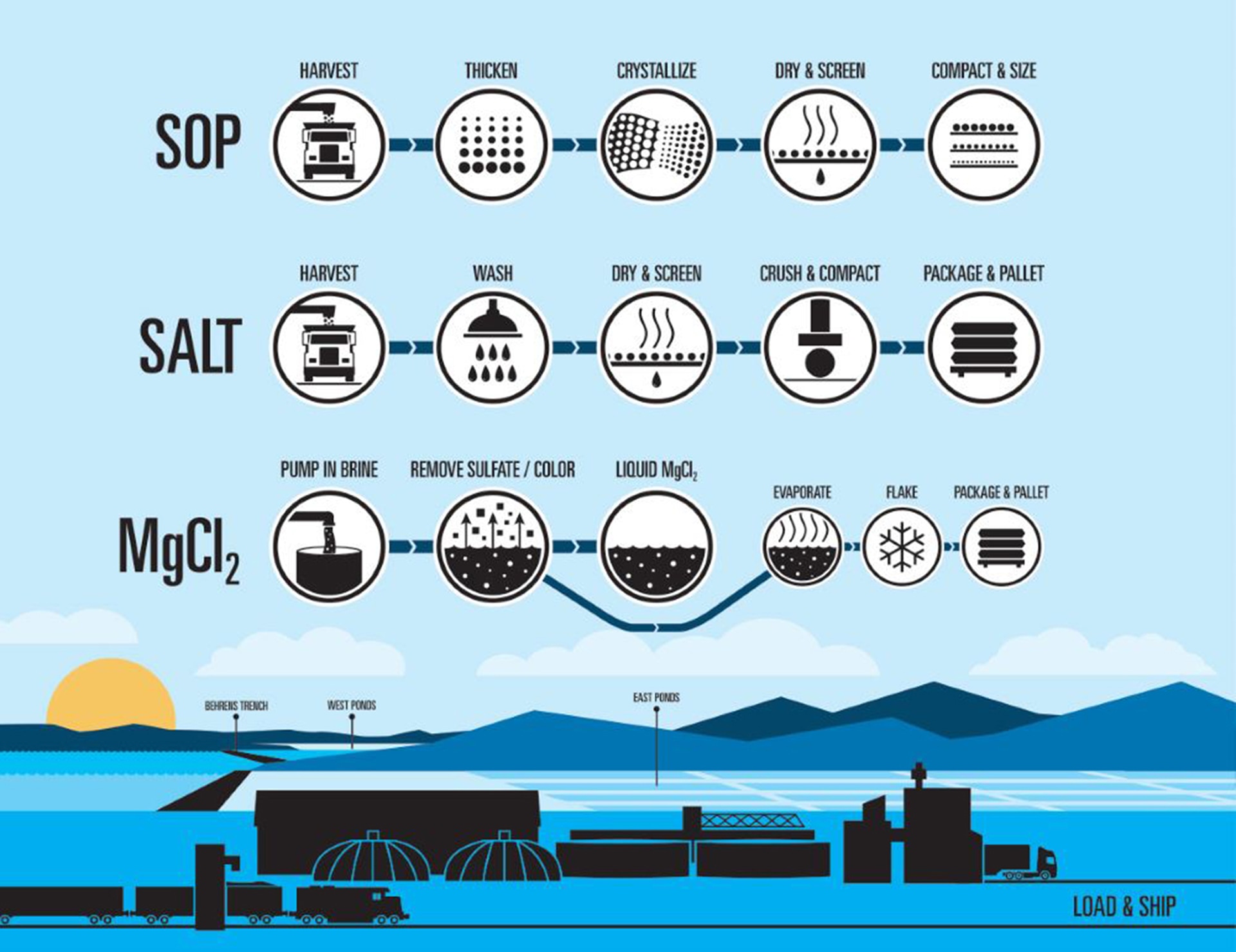 Our 50,000-acre solar evaporation pond complex in Utah produces salt, sulfate of potash (SOP) and magnesium chloride for a variety of uses. It is one of only four locations in the world that can produce SOP from a naturally occurring brine source using solar evaporation. The Ogden location has operated on the Great Salt Lake in Ogden, Utah, since 1968 and became part of the Compass Minerals family in 1993.
